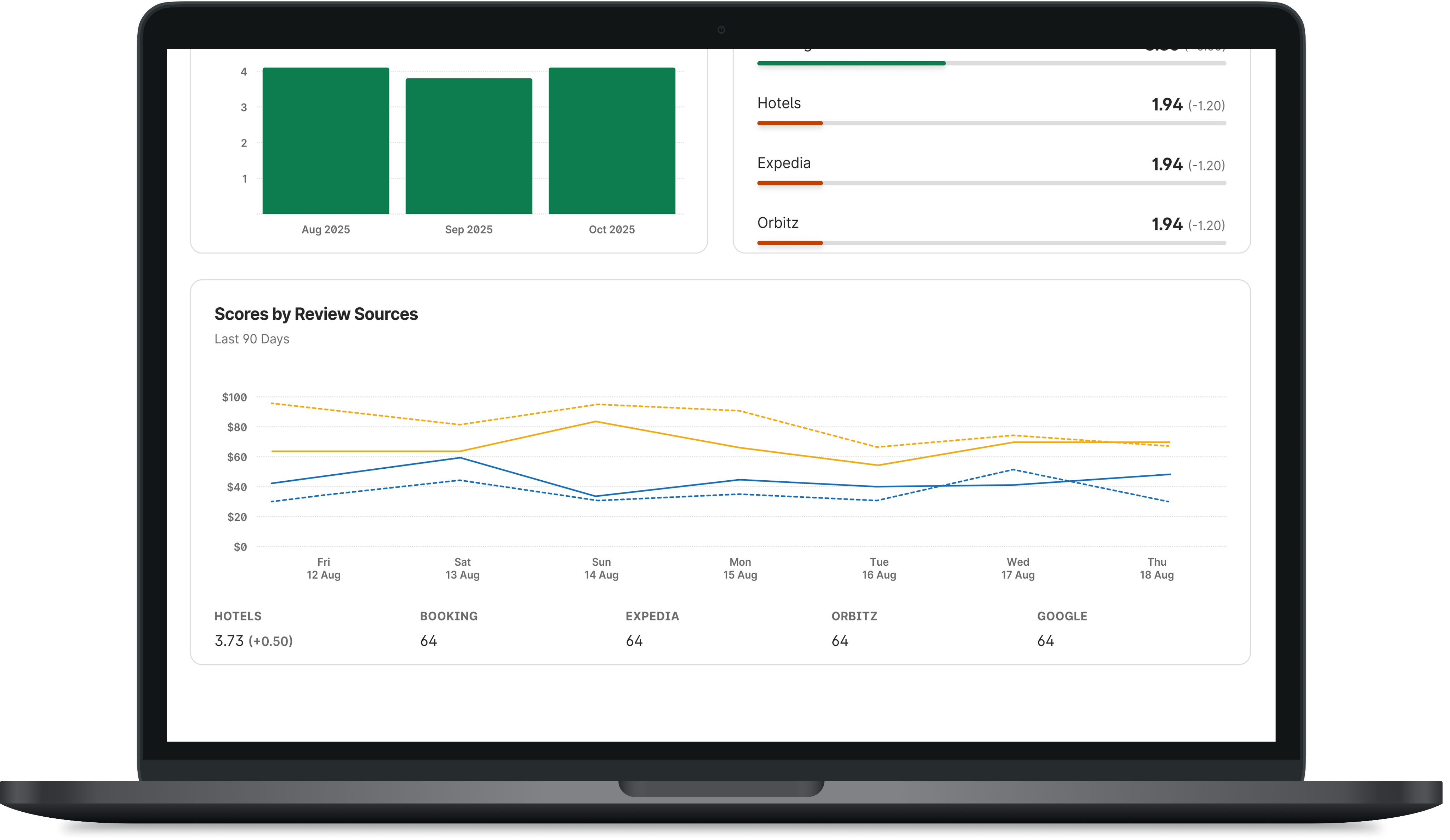 Our AI analyzes all reviews to surface sentiment, issues, strengths, trends, and benchmarks—giving you a full 360° view of guest perception.