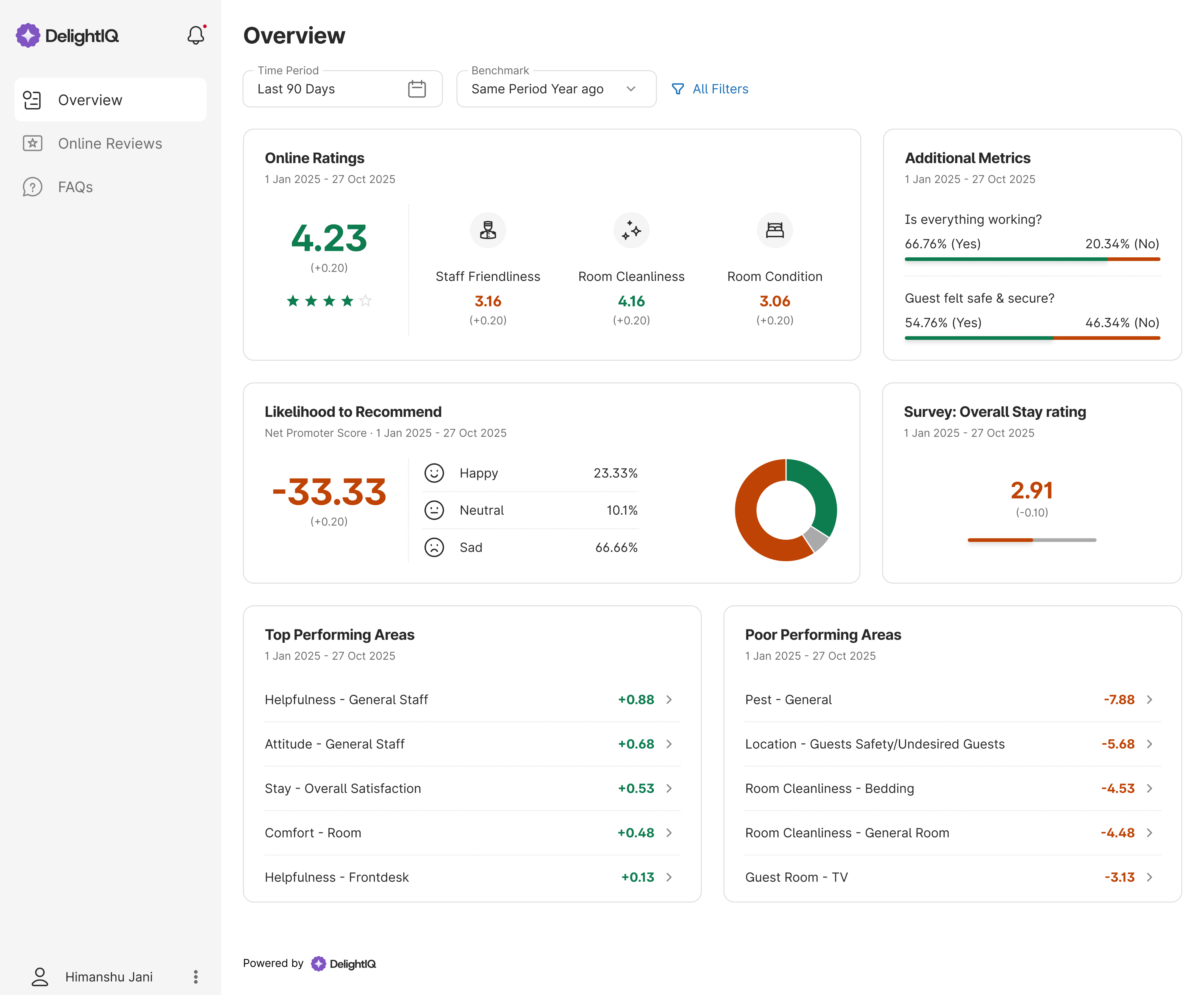 DelightIQ turns complex feedback into quick, clear takeaways plus AI-guided actions to help your team boost ratings and satisfaction.