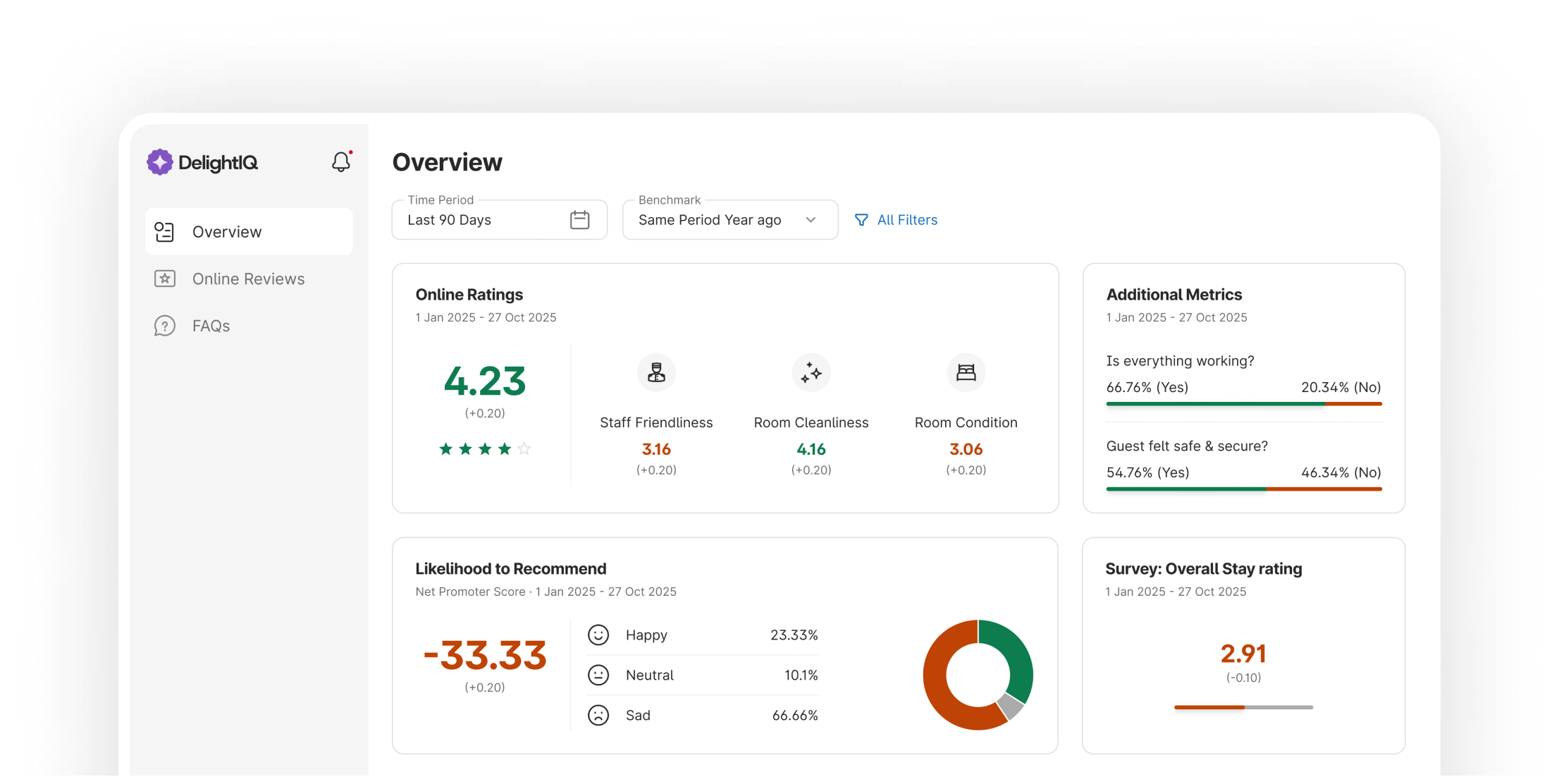 Guest feedback is everywhere—OTAs, platforms, channels. DelightIQ brings it together, analyzes it deeply, and surfaces what actually matters.