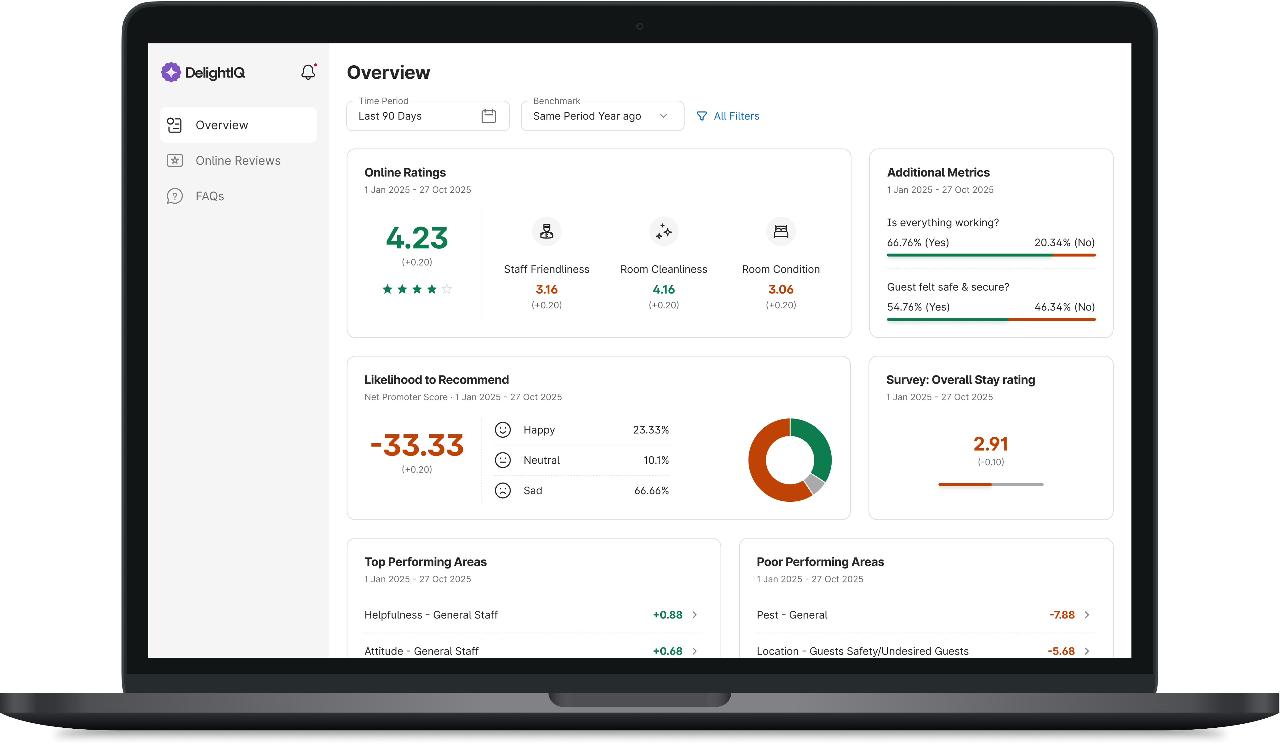 DelightIQ turns complex feedback into quick, clear takeaways plus AI-guided actions to help your team boost ratings and satisfaction.